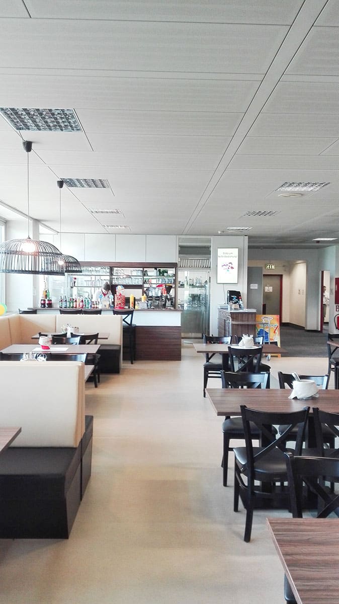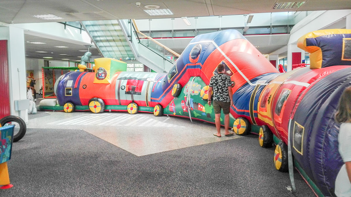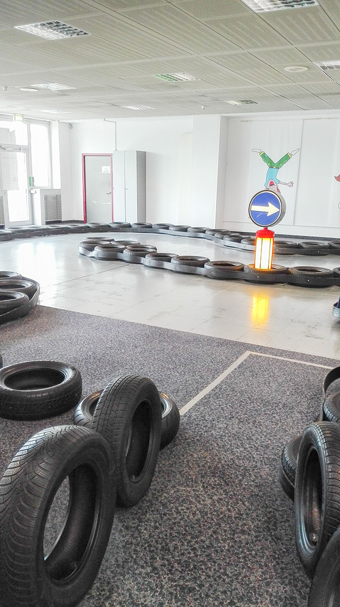 Die „Anlage“ erstreckt sich über zwei Etagen. Die obere ist für kleine Kids uninteressant und wird, so wie ich beobachten konnte, vorwiegend für Geburtstagsfeiern genutzt. Oben befinden sich ein Fußballplatz und ein riesiges Bällebad. Unten gibt es die oben erwähnten Attraktionen, wo die Nutzung meistens im Preis inkludiert ist. Das Fahren mit den Elektroautos kostet 50 Cent. Und will man mit dem Hubschrauber fliegen, oder mit dem Hammer auf Frösche hauen, kostet das auch extra. Die Speisekarte ist klein und enthält die gängigsten Speisen, die Kinder vermeintlich mögen (Pommes, Wiener mit Pommes, Bernerwürstel mit Pommes, Spaghetti Bolognese, für Eltern gibt es Caprese, Salatteller mit Hühnerstreifen, als Dessert werden Apfelkuchen und Pudding-Kirschkuchen angeboten).