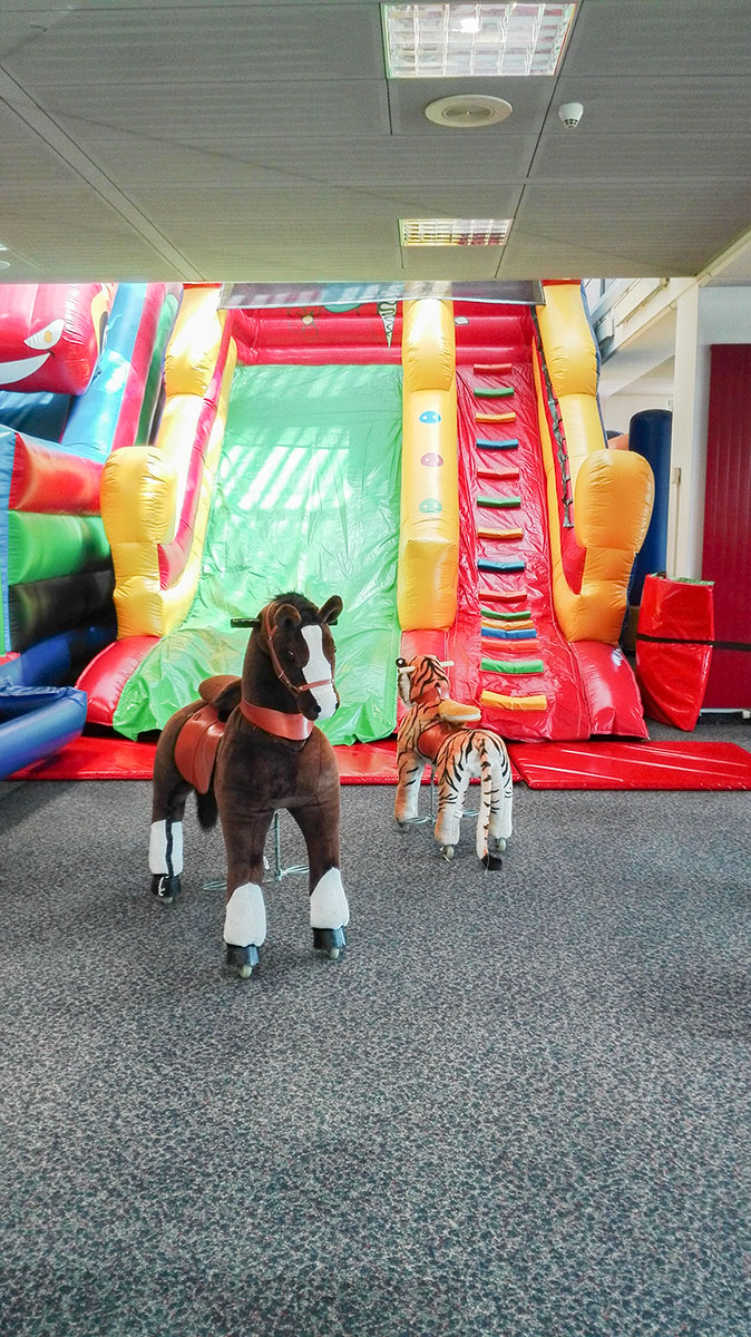 Nun hoffte ich, seine blauen Augen leuchten zu sehen und war enttäuscht, als das nicht (gleich) der Fall war. Es war kaum was los, es war angenehm kühl, die Bäuche haben wir uns vollgeschlagen…aber keines der „Attraktionen“ schien ihn zu interessieren, oder in irgendeiner Form seine Aufmerksamkeit zu erregen. Nicht die Trampoline, nicht die Elektrofahrzeuge, nicht die Pferde…gar nichts. Nach einer halben Stunde dachte ich mir, ok, das war‘s. Die 15 € Eintrittsgeld (für uns drei) waren umsonst. Wir packen zusammen und fahren. Aber da kam dann Felix und sagte, er will etwas essen und trinken. Ich: „Was, du willst was essen? Aber du hattest doch so viel gegessen…“ Bis mir einfiel, dass der kleine Mann bis auf die Cornflakes und den Saft eigentlich nichts mehr zu essen bekommen hat. Und glatt bestellte ich eine große Portion Pommes. Mensch, was für eine Rabenmutter ich doch bin. 😉 Ich brauch vermutlich nicht zu erwähnen, dass diese riesen Portion Pommes vom Sohnemann ratzfatz aufgegessen wurde. Danach gab es kein Halten mehr. Tante wurde von A nach B gezerrt und es wurde alles, bzw. fast alles, ausprobiert. Die Trampoline sind nicht seins. Ok. Merk ich mir. Dafür aber die Elektroautos. Nach fünf Jetons habe ich aufgehört zu zählen. Ein Jeton ist im Eintritt inbegriffen, jeder weitere kostet 50 Cent. Der aufgeblasene Zug mitten im Raum, den gab es z. B. beim ersten Besuch nicht, war ihm etwas zu angsteinflößend. Bei den Eingängen bläst kalte Luft raus und er ist ewig lang. Find es durchaus verständlich, dass er da nicht durchgehen wollte. Dafür war er von den Pferden, groß wie klein, angetan. Wobei er sie selbst noch nicht „reiten“ konnte. Die Rollrutsche(n) ganz hinten im Raum sind für ihn noch etwas zu schnell, selbst mit Begleitung, dafür war die Rutsche mit Bällebad der Renner. Keine Ahnung wie oft er da rauf und runter ist. Auch die großen Legosteine und die Schwamm-Bausteine, die seine Tante immer und immer wieder aufbauen musste, damit er sie immer und immer wieder umwerfen konnte, waren der absolute Hit. Das war ein Spaß. Felix war inzwischen schon waschelnass und seine Augen leuchteten. Und ich war versöhnt. Was will man denn mehr?