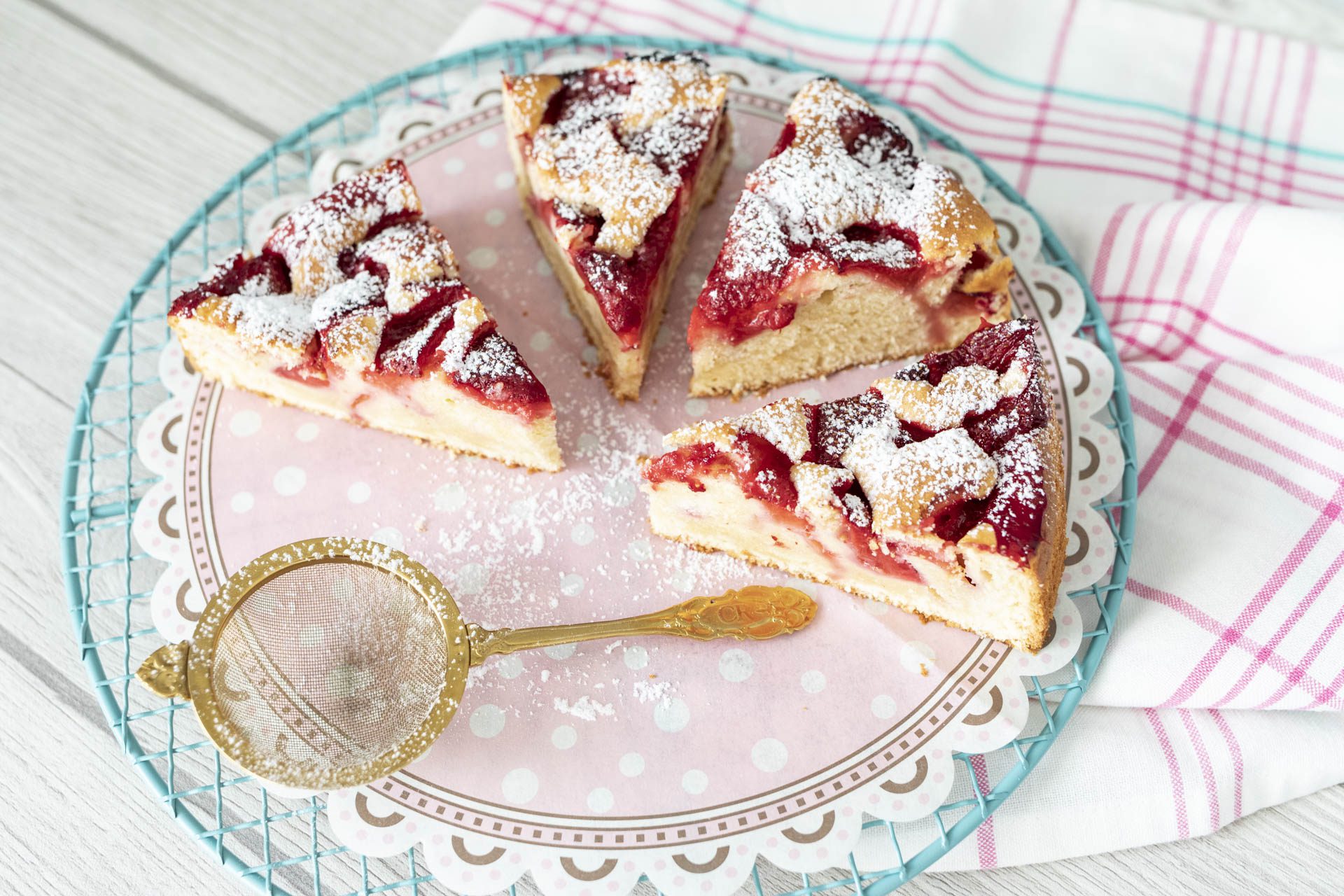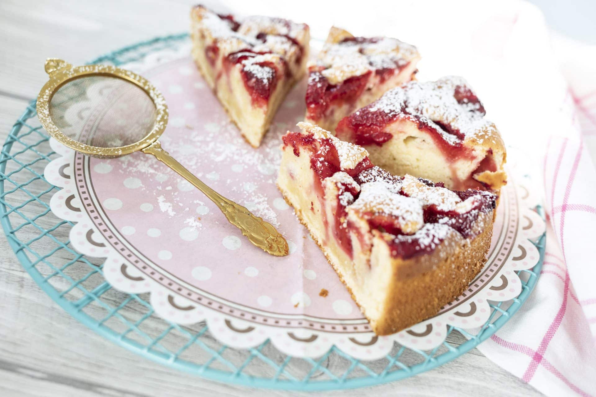 Die Erdbeer-Joghurt-Torte aus dem Backofen nehmen, vom Springformrand lösen und auf einem Kuchengitter auskühlen lassen. Vor dem Servieren mit Puderzucker bestäuben.