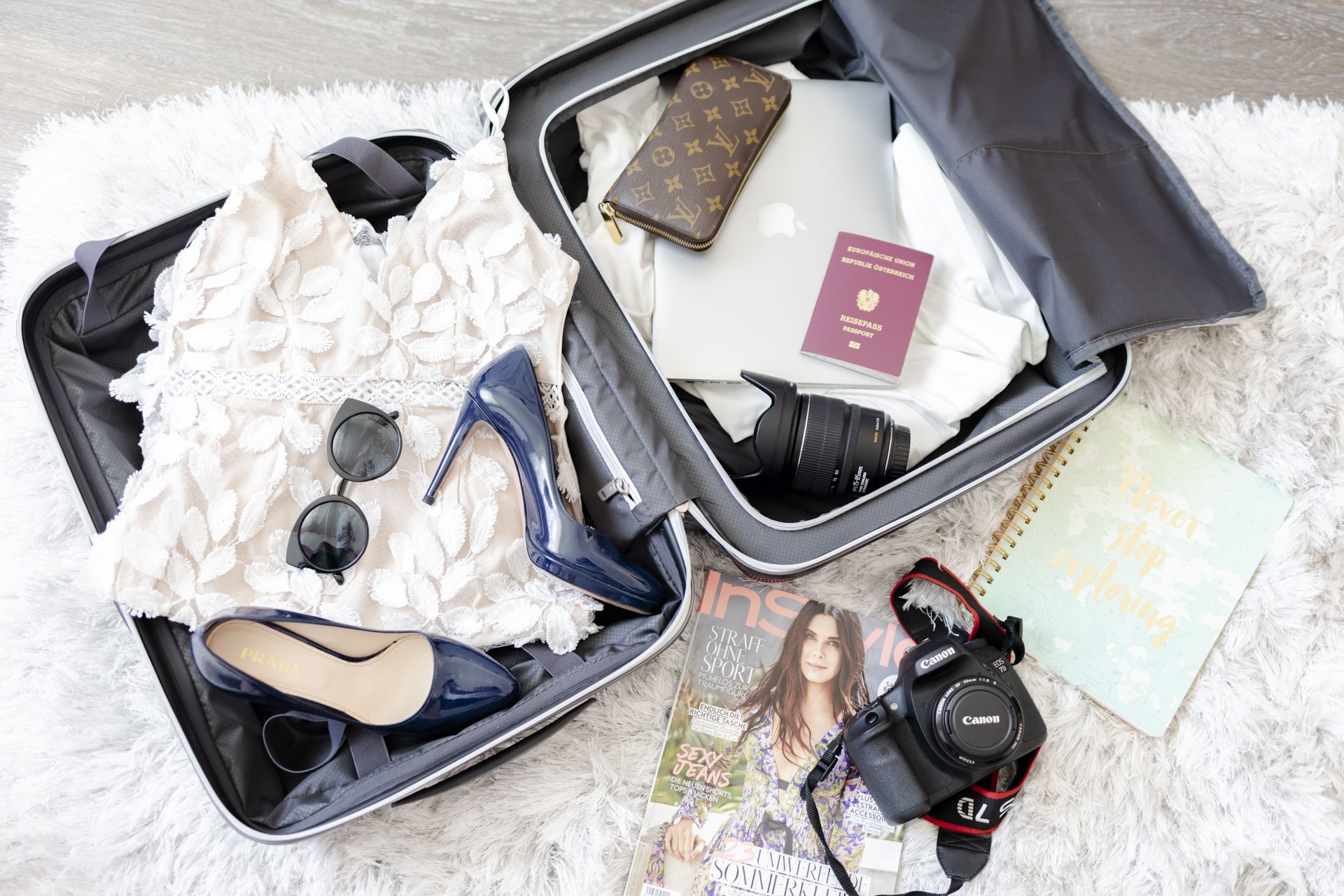 Wer viel reist, braucht einen guten Koffer als treuen Reisebegleiter. Eine Investition lohnt sich und vereinfacht das Reisen enorm. Grundsätzlich müsst ihr euch beim Kauf zwischen Hartschalen- und Weichschalenkoffern entscheiden. Sowohl bei Hartschalenkoffern als auch bei den weichen Versionen schneiden die Koffer von Samsonite am besten ab. Wir sind seit Jahren treue Samsonite Kunden und reisen ausschließlich mit Koffern des Labels. Dieses Jahr haben wir unsere Reisebegleiter um die trendigen Koffersets der Linie Mixmesh erweitert. Auf den letzten Reisen waren sie mit und was soll ich sagen, die Marke bleibt ihren hohen Qualitätsstandards treu. Die Mixmesh Reihe ist aus strapazierfähigem mit feinem Mesh-Gewebe überzogenem Polycarbonat. Der außergewöhnliche Materialmix und die coolen Farbakzente machen die Koffer auf jeder Reise zu einem echten Blickfang. Durch die Doppelrollen und das leichtgängige Doppelgestänge ist der Koffer beim Fahren angenehm leise. Die Rollen sind leichtgängig 360° drehbar und erleichtern so das Navigieren mit dem Koffer. Für optimale Sicherheit sorgt das TSA-Zahlenschloss. Die Koffer lassen sich beidseitig packen, haben einen Reißverschluss-Gepäcktrenner, Teleskopgestänge, Kreuzspanngurte und praktische Innentaschen. Also nicht nur optisch ein Muss, sie überzeugen auch in puncto Handlichkeit, Platzangebot und sicherer Schutz. Die Koffer gibt es in vier verschiedenen Farben und Größen. Wir haben das komplette Set, nutzen jedoch die Größen 81 x 54 x 34 cm und 55 x 40 x 20 cm am meisten. Wobei ich die Größe 69 x 45 x 29 cm praktisch für einen 2-Tage-Trip finde. Beispielsweise hatte ich gerade diese Größe für einen zweitägigen Krankenhausaufenthalt genommen. Mir persönlich gefällt die Farbe Grey/Capri Blue am besten.